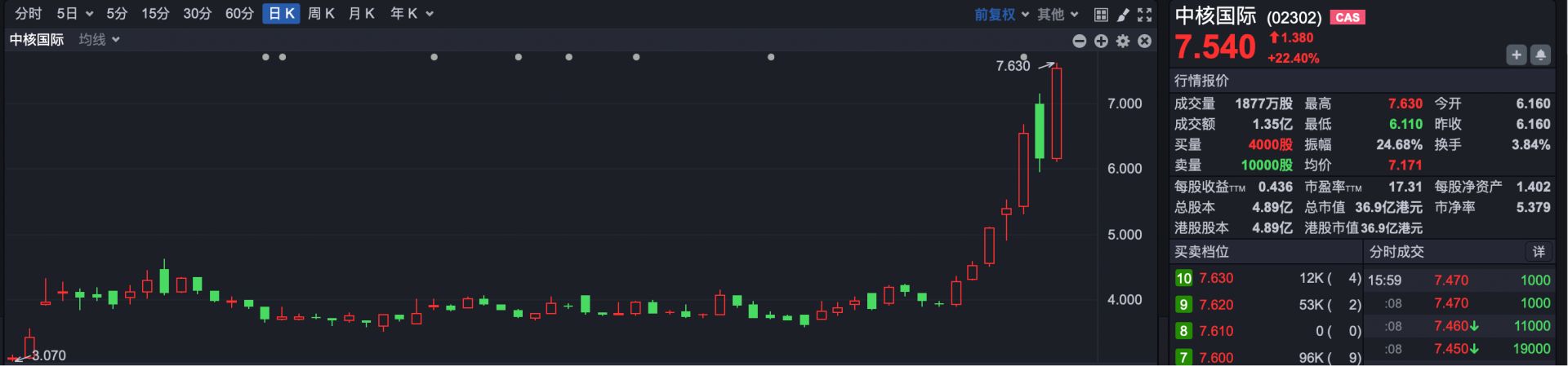 其他热点,港股核电板块走强,中核国际 (02302.HK) 大涨 22%,中广核矿业 (01164.HK) 涨超 7%,上海电气 (02727.HK)、哈尔滨电气 (01133.HK)、东方电气 (01072.HK) 等跟涨。