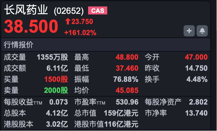 新股方面,长风药业 (02652.HK) 上市首日大涨。截至收盘,长风药业上涨 161%,涨幅较上午有所收窄。公开发售阶段,长风药业获约 6697.8 倍超额认购,共接获近 26.42 万份有效申请。由于认购倍数极高,公开发售股份最终数目增至 412 万股,占全球发售股份总数的约 10%。申购一手的投资者获配发股份的几率极低,中签率仅为 1%。国际配售部分同样获得超额认购,倍数约为 12.74 倍。