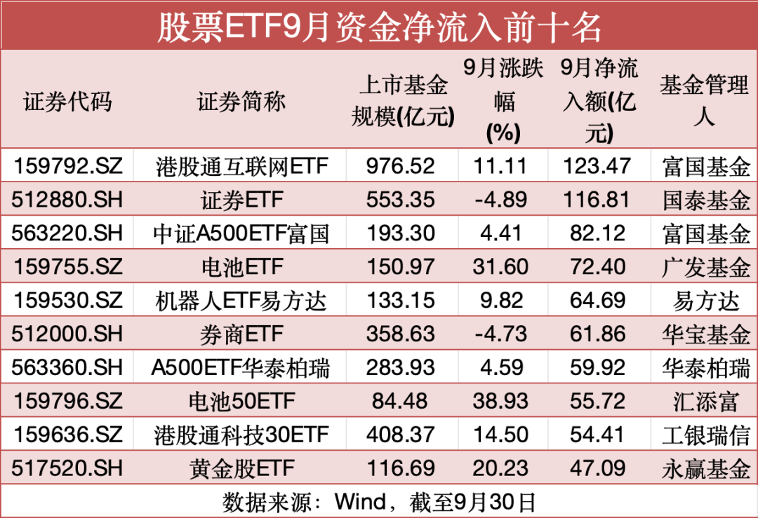 9月份超千亿元资金涌入股票ETF 部分股票ETF资金净流入超百亿元