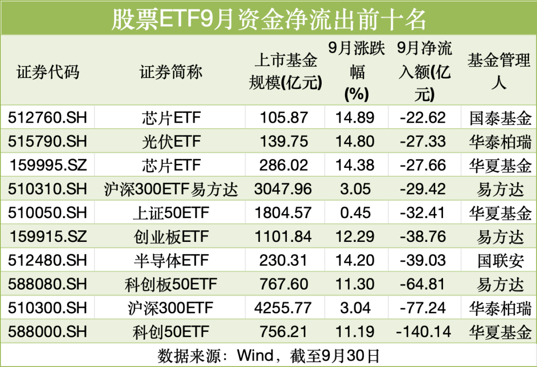 9 月份超千亿元资金涌入股票 ETF 市场,单只产品也出现较为可观的资金净流入,部分股票 ETF 资金净流入超过百亿元。