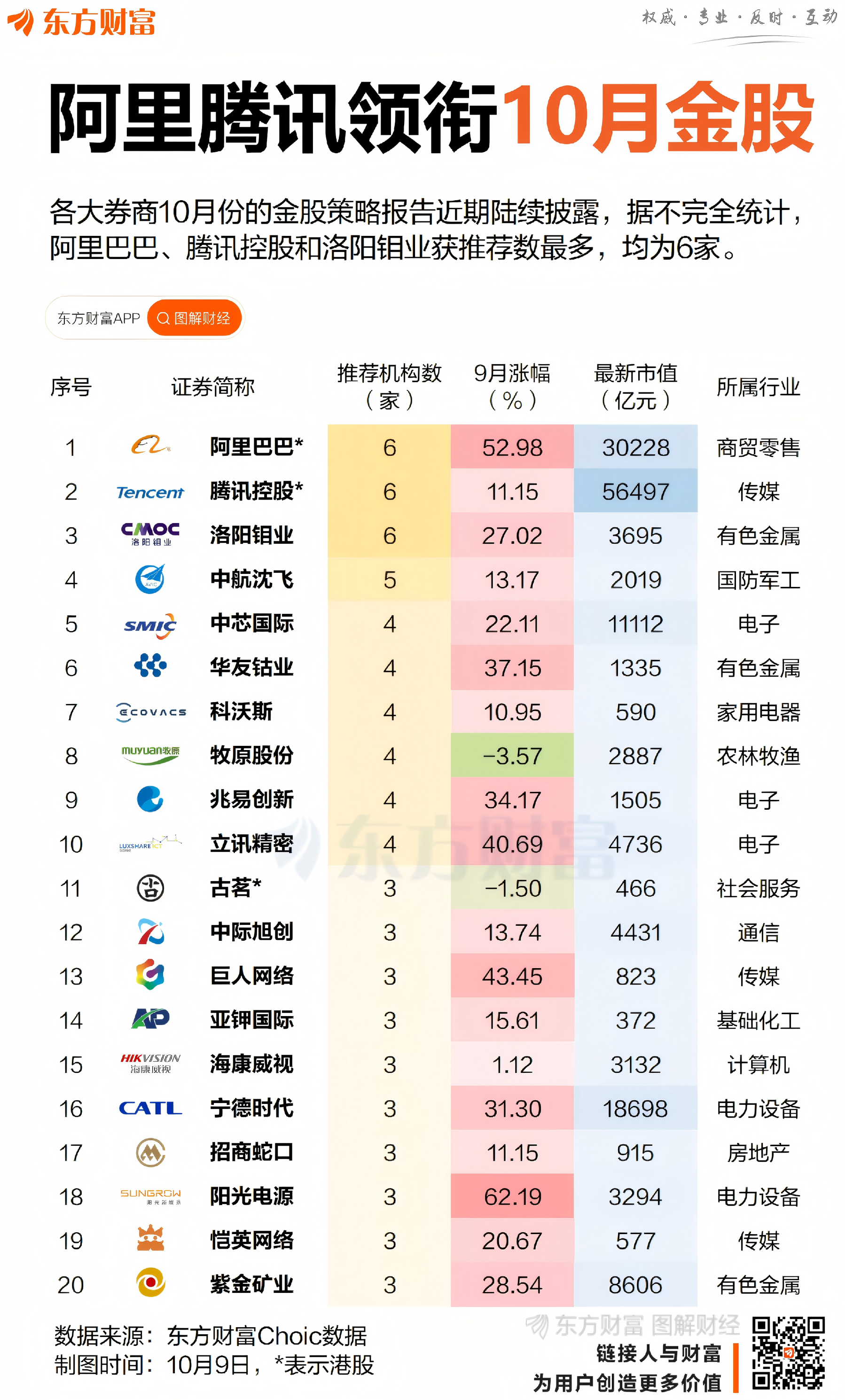 券商10月金股出炉!这些股最受青睐 包含阿里、腾讯