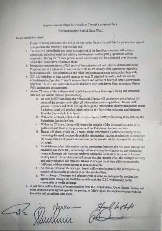 据央视新闻,当地时间 10 月 9 日夜间,以色列公共广播公司 Kan 发布了以色列、哈马斯和调解员在埃及签署的释放被扣押人员和结束加沙冲突的协议副本。这份文件详细介绍了该协议的各个部分。