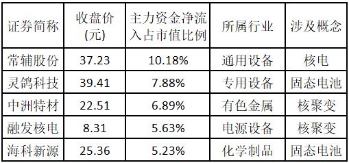 主力资金净流入金额占市值比例排名前 5 的个股分别为常辅股份、灵鸽科技、中洲特材、融发核电、海科新源。