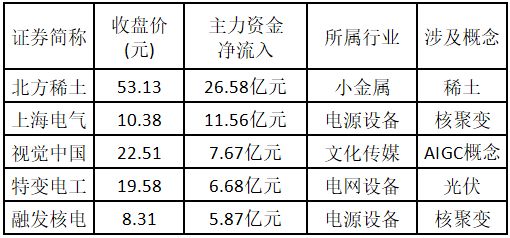 从主力资金来看,今日涨停板个股中,主力资金净流入金额排名前 5 的个股分别为北方稀土、上海电气、视觉中国、特变电工、融发核电。