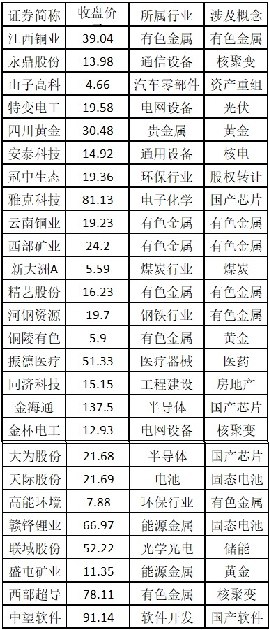 涨停板个股中,股价创出近一年新高的个股有 26 只 (不包括创出历史新高的个股),包括江西铜业、永鼎股份、山子高科、特变电工、四川黄金、安泰科技、冠中生态、雅克科技、云南铜业、西部矿业、新大洲 A、精艺股份、河钢资源、铜陵有色、振德医疗、同济科技、金海通、金杯电工、大为股份、天际股份、高能环境、赣锋锂业、联域股份、盛屯矿业、西部超导、中望软件,具体如下表所示。