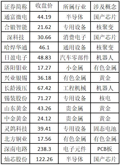 从涨势强度来看,涨停板个股中,股价创出历史新高的个股共有 15 只,包括通富微电、合锻智能、深科技、哈焊华通、日盈电子、洛阳钼业、兴业银锡、长龄液压、锡装股份、山东黄金、中金黄金、灵鸽科技、北方铜业、深南电路、灿芯股份。欢迎大家关注微信公众号 「道达号」,「道达涨停复盘」 栏目为大家复盘市场涨停数据。