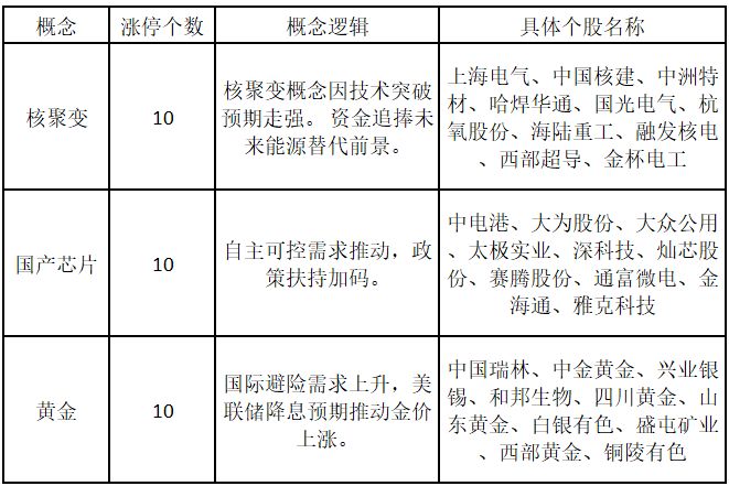 从概念特征来看,今日涨停板个股中,核聚变、国产芯片、黄金概念的个股最多。