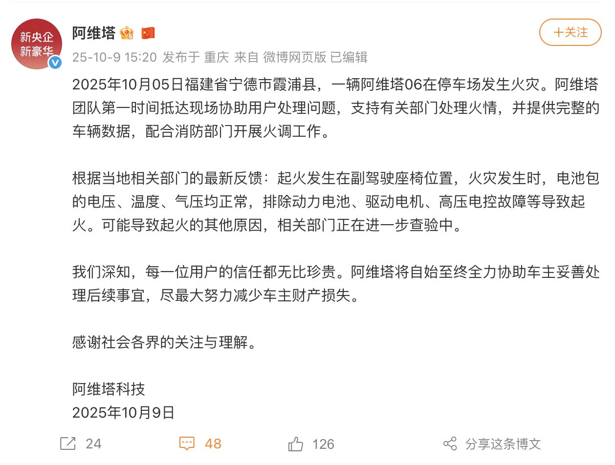 10 月 9 日,@阿维塔发布情况说明:2025 年 10 月 05 日福建省宁德市霞浦县,一辆阿维塔 06 在停车场发生火灾。阿维塔团队第一时间抵达现场协助用户处理问题,支持有关部门处理火情,并提供完整的车辆数据,配合消防部门开展火调工作。根据当地相关部门的最新反馈:起火发生在副驾驶座椅位置,火灾发生时,电池包的电压、温度、气压均正常,排除动力电池、驱动电机、高压电控故障等导致起火。可能导致起火的其他原因,相关部门正在进一步查验中。