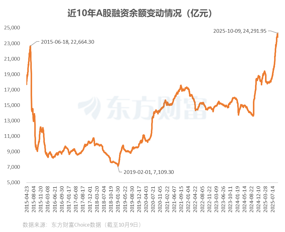 来源: 人民财讯 截至10月9日,市场最新融资余额为24291.95亿元,续创历史新高,较上个交易日环比增加508.05亿元,当日融资增加额仅低于去年10月8日,创历史次高,2024年10月8日融资增加额为1074.86亿元。 延伸阅读 (人民财讯) 文章转载自东方财富