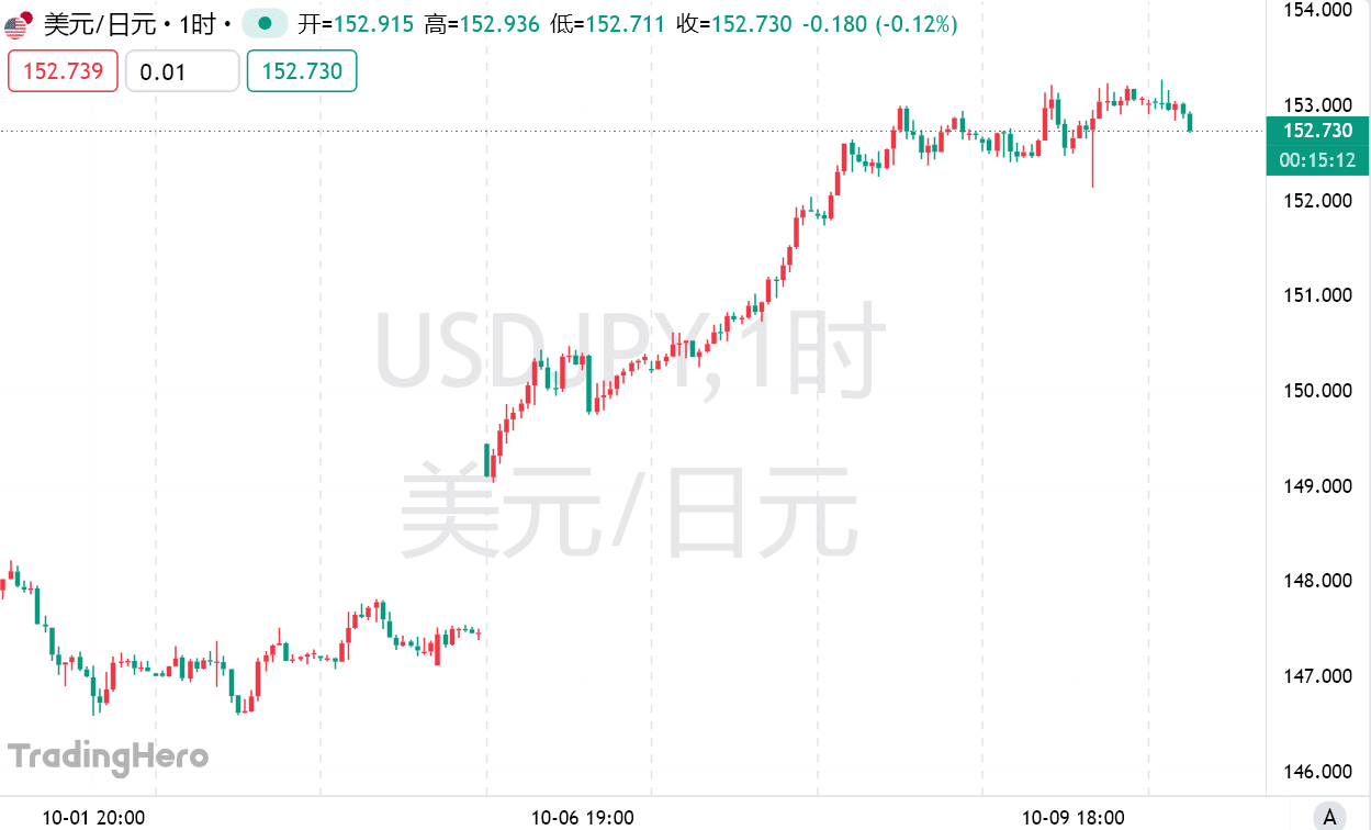 周五早间美元兑日元汇率交投于 152.94 附近,盘中一度触及 153.27 高位。
