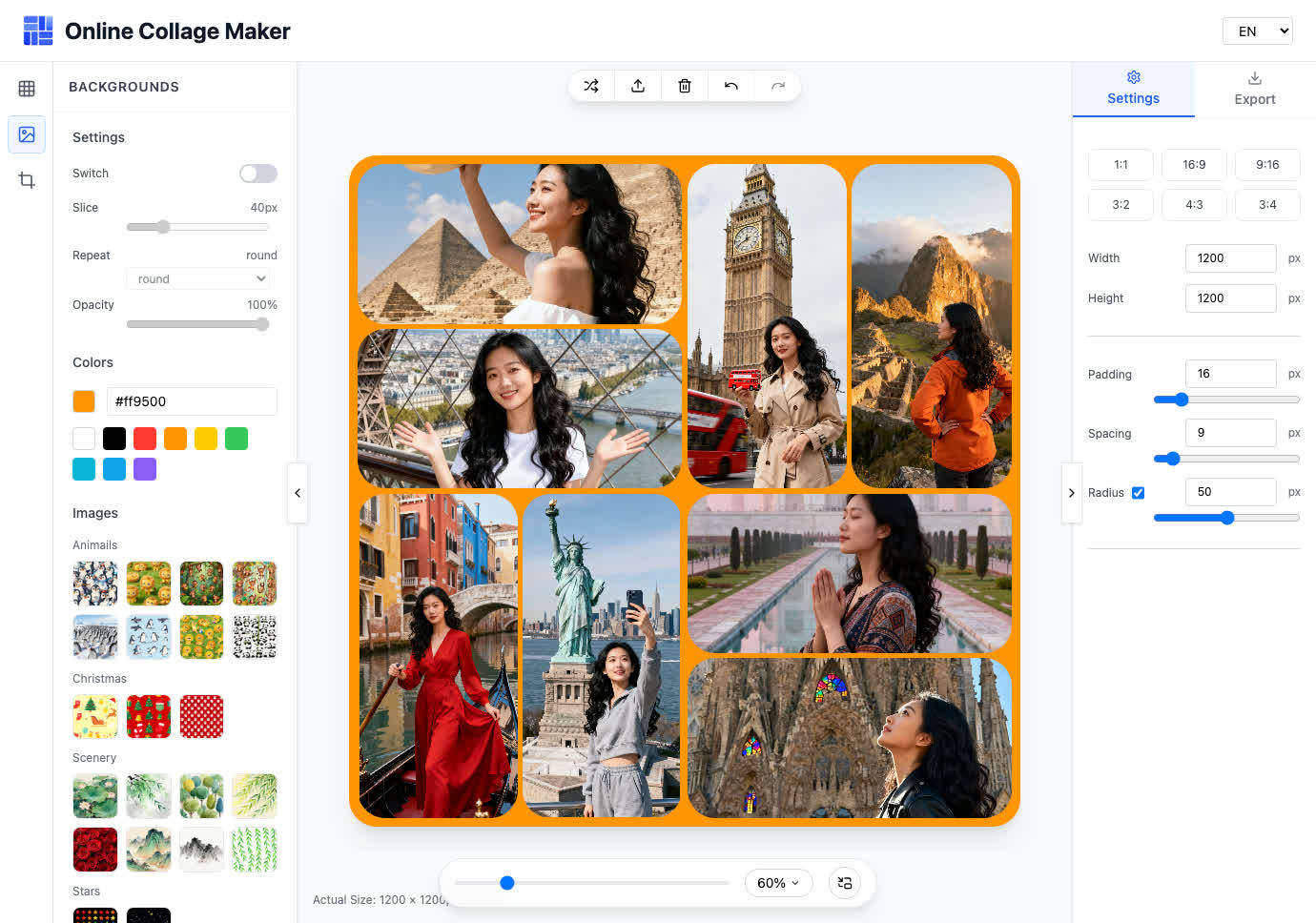 在浏览器里完成图片拼贴:拖拽添加与排布照片,自定义行列与间距,支持纯色/图片背景与九宫格相框;提供旋转、翻转、透明度与精确移动;支持高清导出、透明圆角 PNG 与自定义分辨率。