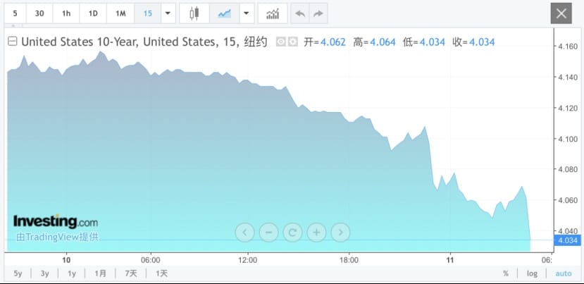 美东时间 10 月 10 日,买盘在整个交易时段持续涌入美国国债市场,美国 5 年期国债收益率一度下跌 10 个基点,美国 10 年期国债收益率下挫 11.8 个基点,报 4.034%;美国 30 年期国债收益率下跌 9.4 个基点至 4.639%。