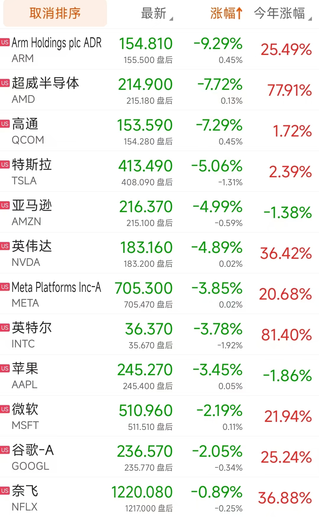 其中美股大型科技股普跌,ARM 跌超 9%,超威半导体、高通跌超 7%,特斯拉跌超 5%,亚马逊、英伟达跌超 4%。Meta、英特尔、苹果、微软、谷歌也明显下跌。