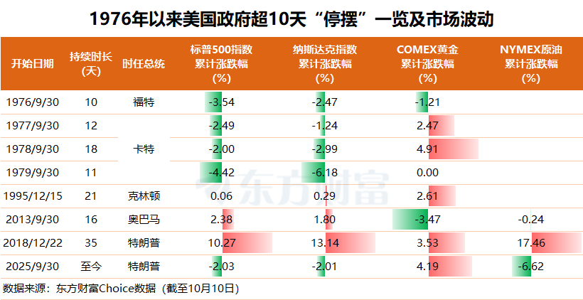 申万宏源证券首席经济学家赵伟则从历史经验看,此类政府关门对大类资产的长期影响相对有限。美股并不必然恐慌下跌,标普 500 指数胜率 75%,美国政府关门期间平均涨幅 2.91%;过去几轮 5 天及以上的政府关门期间,标普 500 指数收益率分别为 1.2% 、-0.03%、2.45%、8%。