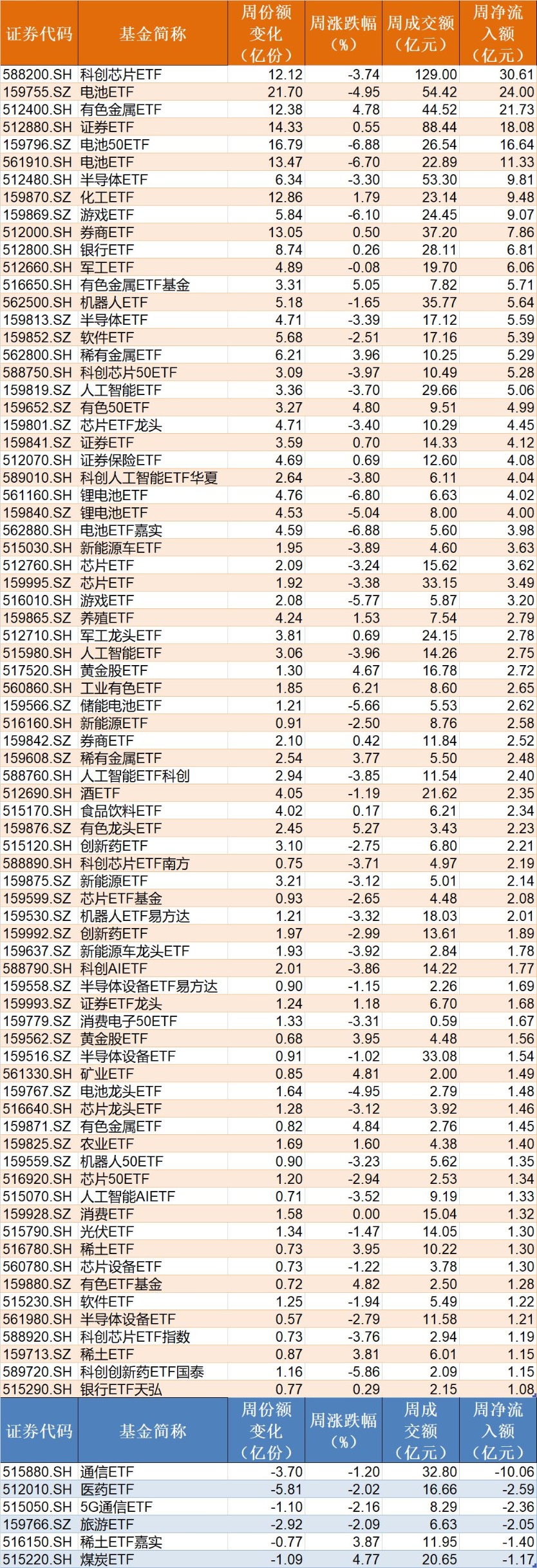 行业主题上看,科创芯片、电池、有色金属等 ETF 被资金看好,而通信、医药相关 ETF 被资金抛售。