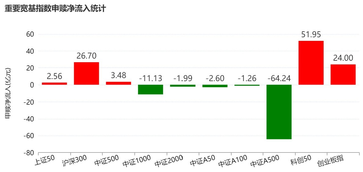 细分来看,主要宽基指数整体资金申赎统计显示,本周科创 50 净流入 51.95 亿元,中证 A500 净流出 64.24 亿元。