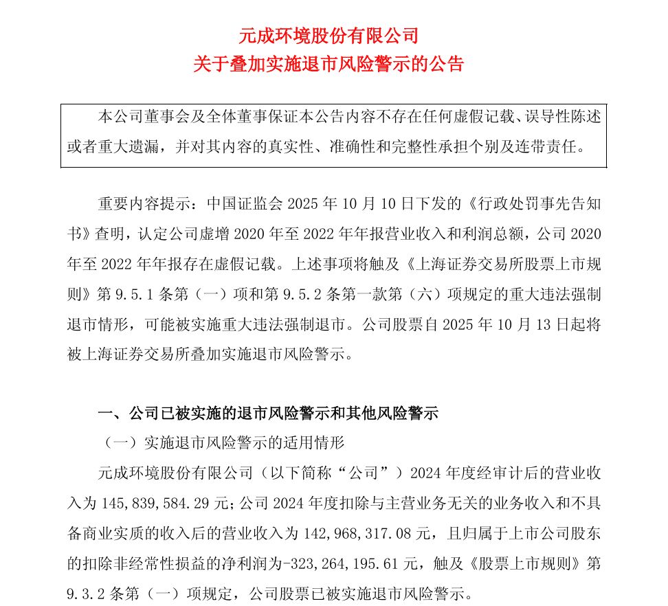 据证监会 10 月 10 日消息,其对*ST 元成涉嫌定期报告等财务数据虚假记载作出行政处罚事先告知。*ST 元成连续三年虚增收入利润,拟被罚款 3745.46 万元,5 名责任人员合计被罚款 4200 万元,实际控制人被采取 10 年证券市场禁入措施。公司涉嫌触及重大违法强制退市情形,上交所将启动退市程序,可能涉及的犯罪线索将移送公安机关。
