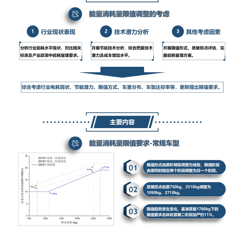 《电动汽车能量消耗量限值第 1 部分:乘用车》(GB 36980.1—2025) 中明确,常规车型能量消耗量限值要求为,整车质量拐点由原 750kg、2510kg 调整为 1090kg、2710kg。电能消耗量限值,基准质量 1780kg 下的限值要求总体较原第二阶段加严约 11%。