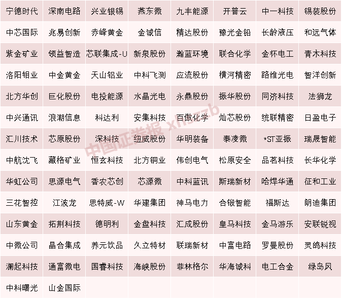 总市值方面,上述创新高的股票中,A 股总市值超千亿元的个股有 20 只。总市值居前的有宁德时代、中芯国际、紫金矿业、洛阳钼业、北方华创,分别为 17427.82 亿元、10236.09 亿元、8204.50 亿元、3577.13 亿元、3170.78 亿元。