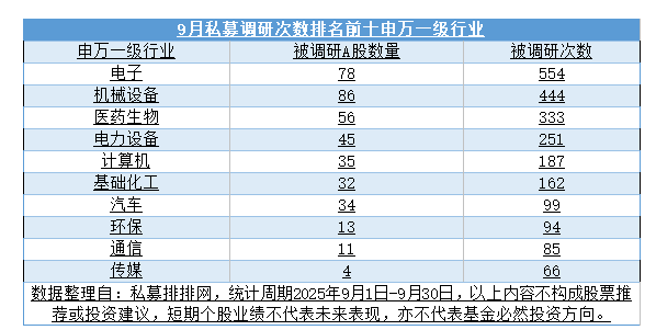 据私募排排网统计,9 月电子成为私募调研频次最多的行业,该行业中 78 只个股接受私募调研,合计调研频次达 554 次。机械设备板块则以 444 次的调研频次紧随其后,被调研个股数量达 86 家。