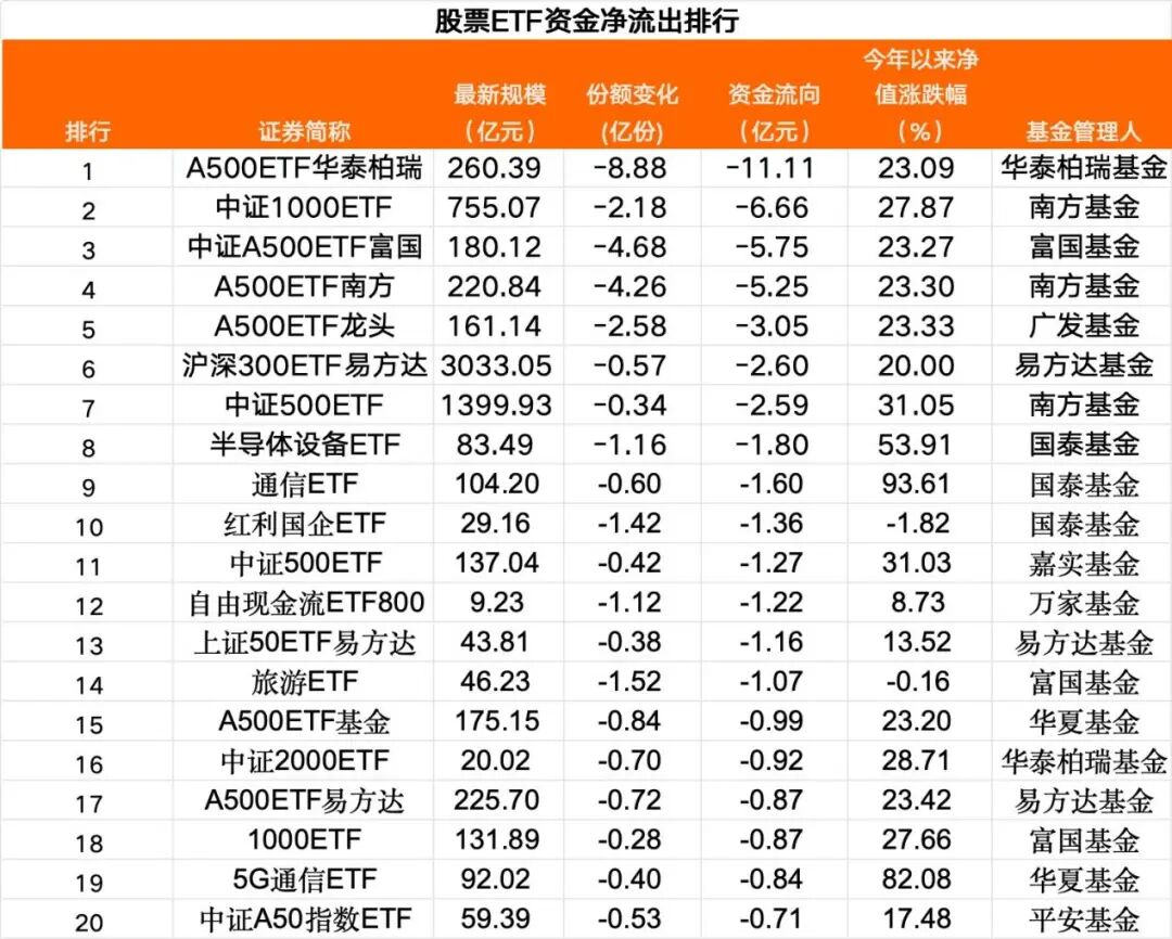 从资金净流出情况来看,上周五当天,股票 ETF 中有 14 只净流出资金超过 1 亿元,跟踪中证 A500 指数、中证 1000 指数、中证 500指数等相关宽基 ETF,以及半导体设备、通信等行业主题 ETF「失血」 相对靠前。