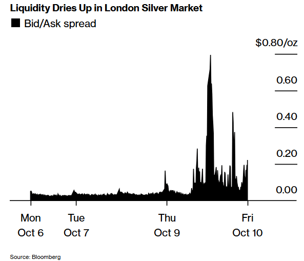 市场承压的另一个迹象是,伦敦白银的买卖价差从其典型的每盎司约 3 美分的水平大幅扩大至远高于每盎司 20 美分。