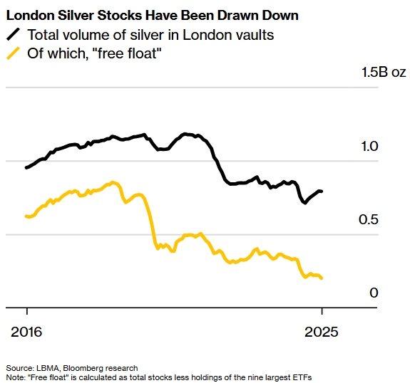 白银市场依赖于存放在伦敦金库中的数亿盎司白银来支撑流动性。近年来该库存持续消耗:首先是由于矿山产量未能跟上投资者及太阳能电池板等工业应用的需求,导致持续出现供需赤字;随后在今年,由于担忧关税,出现了将白银运往美国的狂潮。