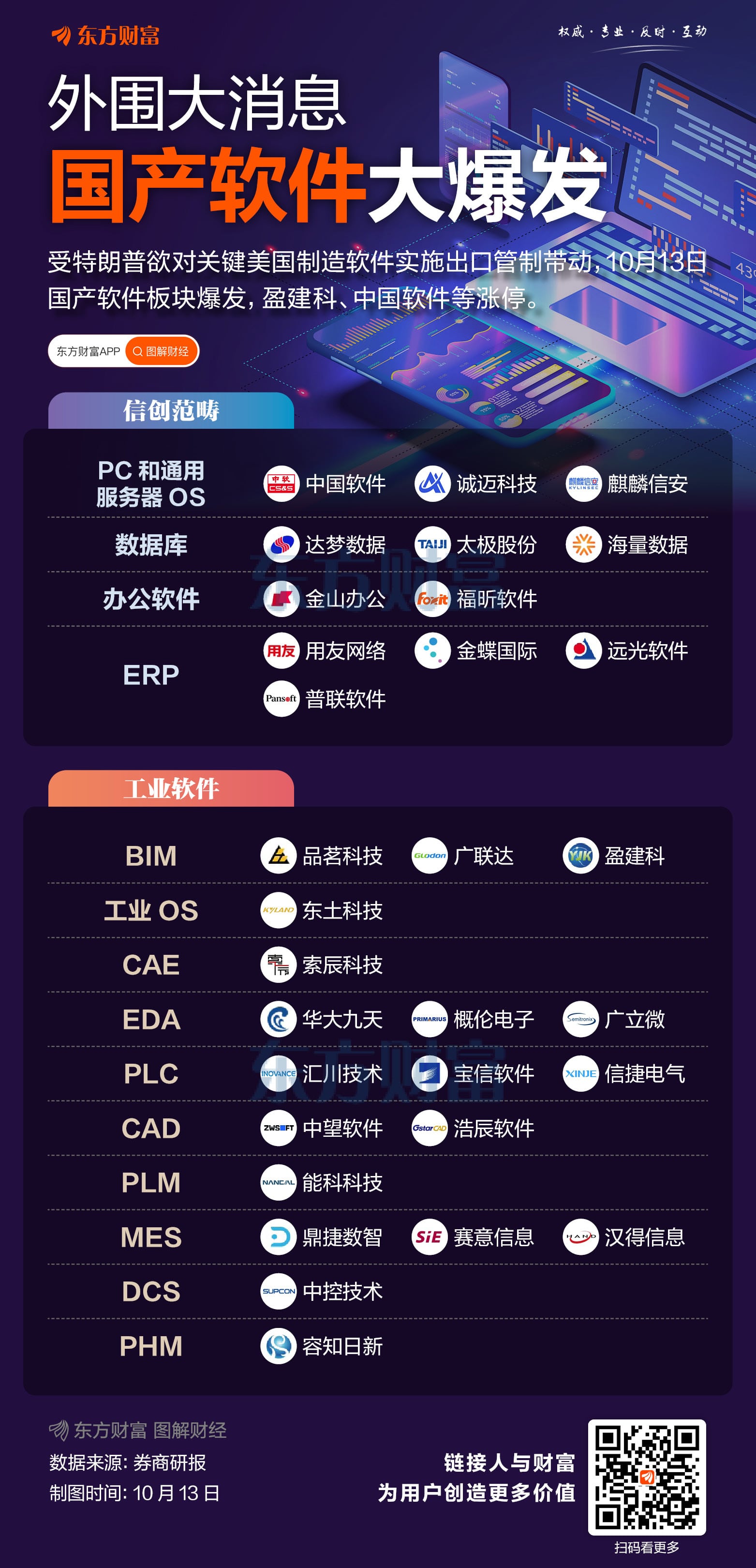 国产软件板块在 10 月 13 日表现强势,当天收盘时盈建科、榕基软件、中国软件纷纷涨停;*ST 东通、国子软件大涨超 10%;诚迈科技、金山办公、浩辰软件、达梦数据等也明显跟涨。