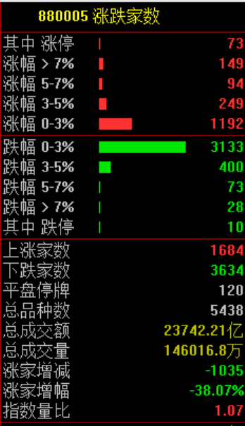 市场共 1684 只个股上涨,73 只个股涨停,3634 只个股下跌。