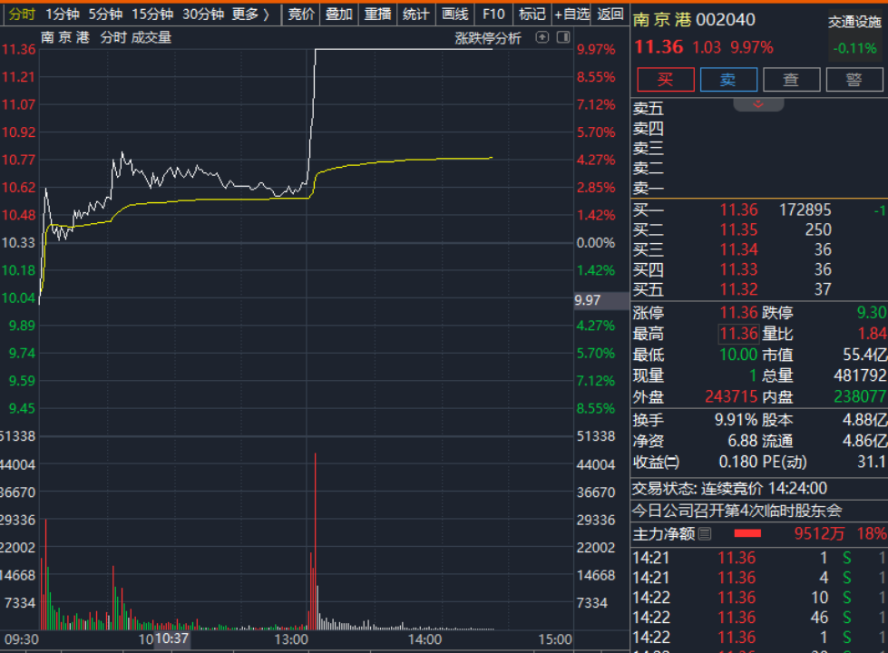 10 月 13 日午后,南京港股价直线拉升,3 分钟内就被资金封死涨停板;连云港也大幅拉升,涨幅一度接近 8%,北部湾港、重庆港也纷纷跟涨;部分航运股也有拉升动作,国航远洋、宁波海运一度涨超 6%,凤凰航运、华光源海等跟涨。