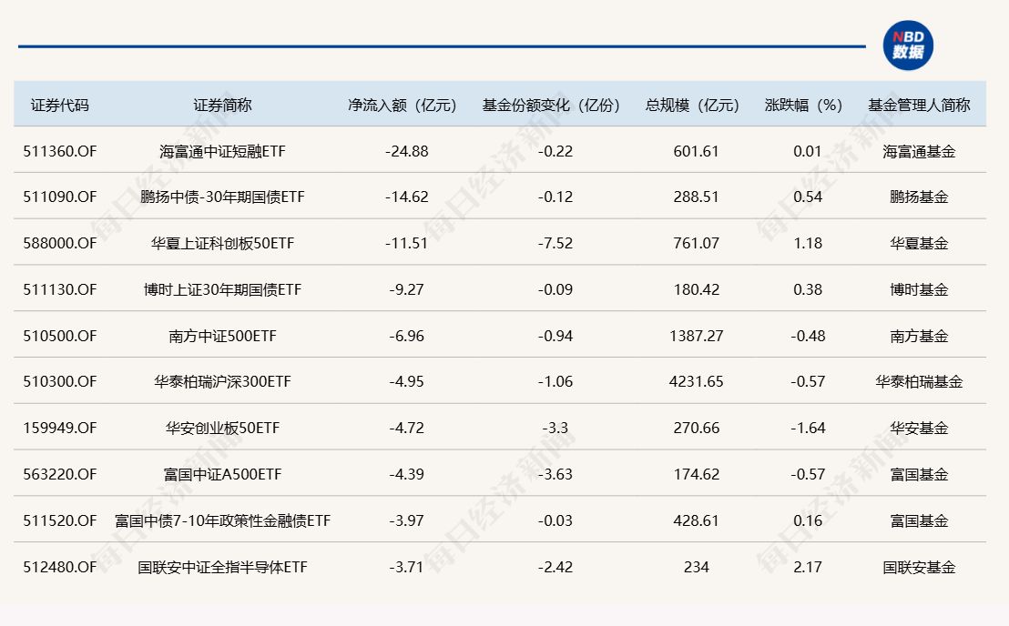 与此同时,海富通中证短融 ETF 基金份额减少 0.22 亿份,净流出额为 24.88 亿元;鹏扬中债-30 年期国债 ETF 基金份额减少 0.12 亿份,净流出额为 14.62 亿元;华夏上证科创板 50ETF 基金份额减少 7.52 亿份,净流出额为 11.51 亿元。