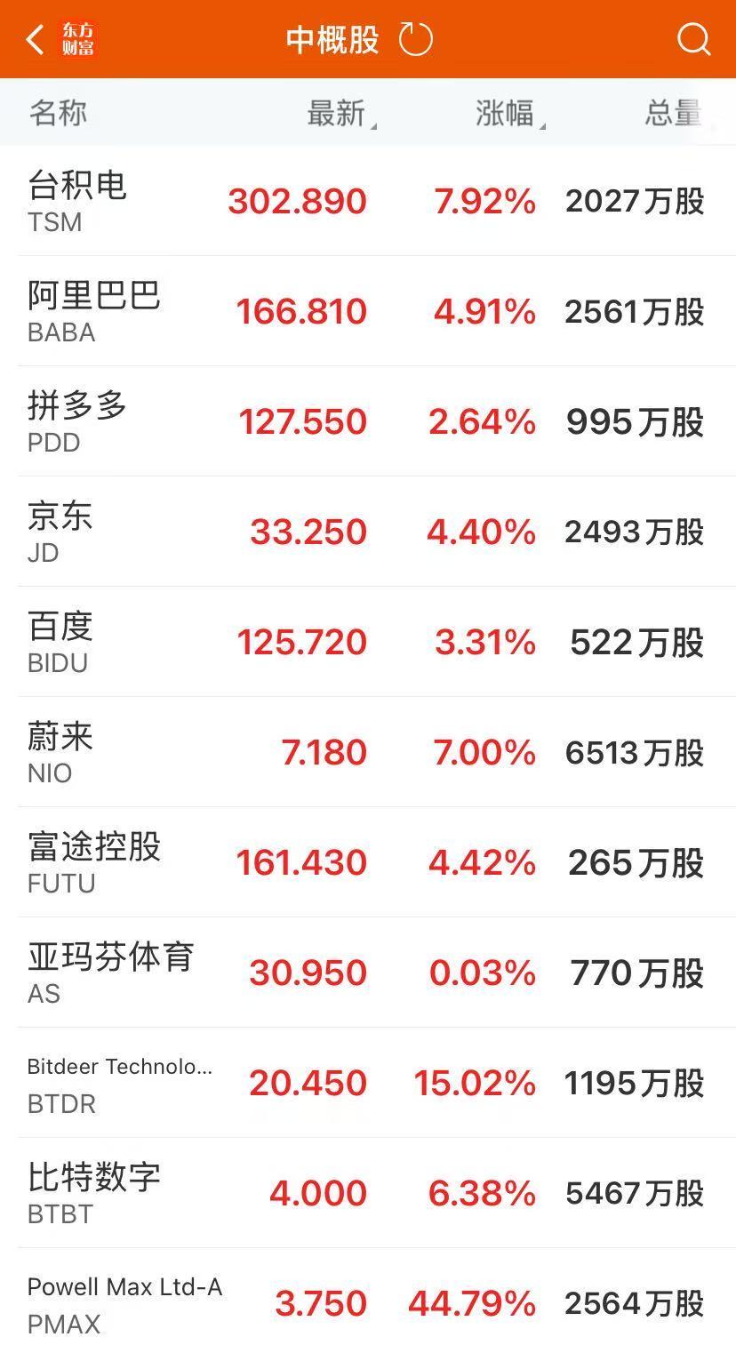 纳斯达克中国金龙指数收涨 3.21%,热门中概股普涨,世纪互联涨超 10%,蔚来涨 7%,名创优品涨超 5%,阿里巴巴、京东涨超 4%,小鹏汽车、百度涨超 3%。