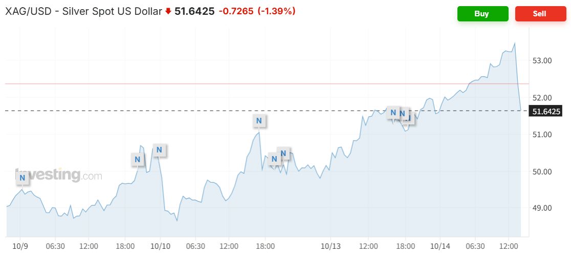 10 月 14 日,现货白银再度创造历史,盘中价格一度冲高至每盎司 53 美元,创下历史新高。截至发稿,价格回落至 51.56 美元。
