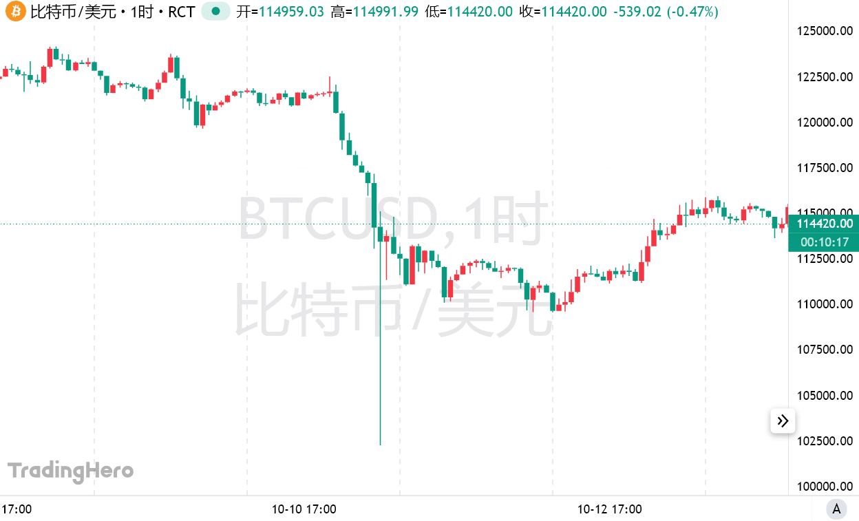 比特币在 10 月 10 日至 11 日期间最低跌至 104782.88 美元,这款全球最大加密货币曾在 10 月 6 日创下超过 126000 美元的历史新高。第二大数字货币以太坊上周五下跌 12.2% 至 3436.29 美元低点。