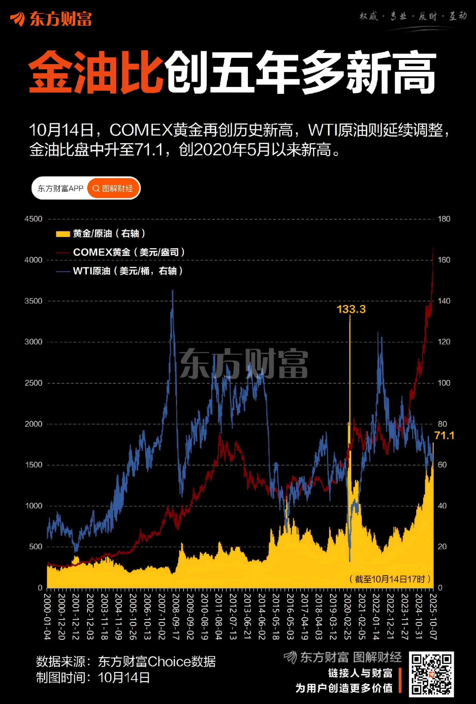 10 月 14 日,COMEX 黄金盘中一度涨至 4190.9 美元/盎司,再创历史新高;WTI 原油则延续调整,最新价已接近 58 美元/桶,金油比随之升破 70 整数大关,创下 2025 年 5 月以来的新高。