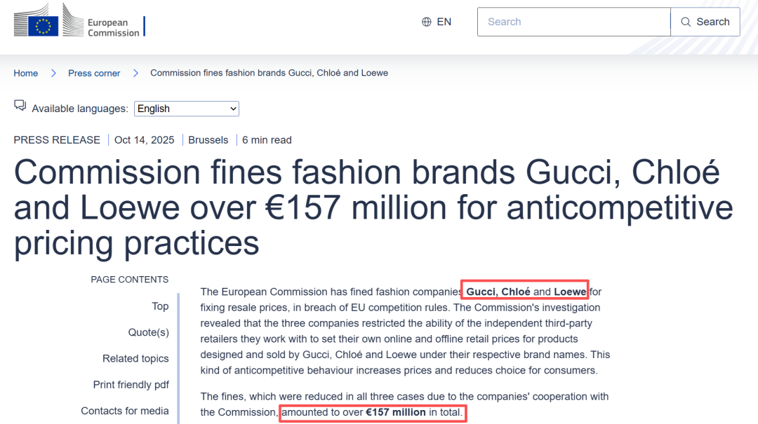 10 月 14 日,欧盟委员会官网显示,欧盟委员会因古驰 (Gucci)、蔻依 (Chloé) 和罗意威 (Loewe) 存在反竞争定价行为,对三家公司处以合计超 1.57 亿欧元罚款。