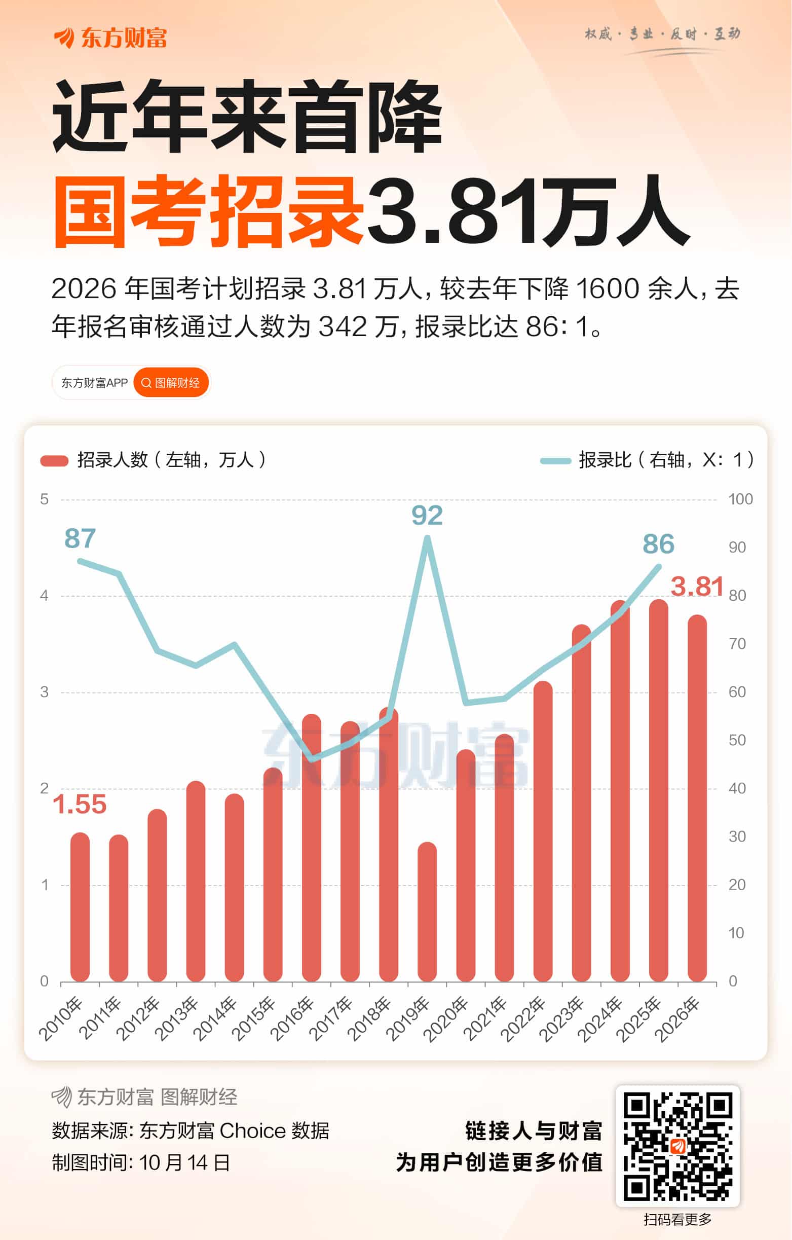 据国家公务员局消息,2026 年国考计划招录 3.81 万人,较去年减少 1600 余人,为近年来首次下降。此外,国考报考年龄限制发生变化,由之前的 35 周岁以下放宽至 38 周岁以下 (应届硕博生由 40 岁放宽至 43 岁),这是自 1994 年发布 《国家公务员录用暂行规定》 以来首次发生变化。