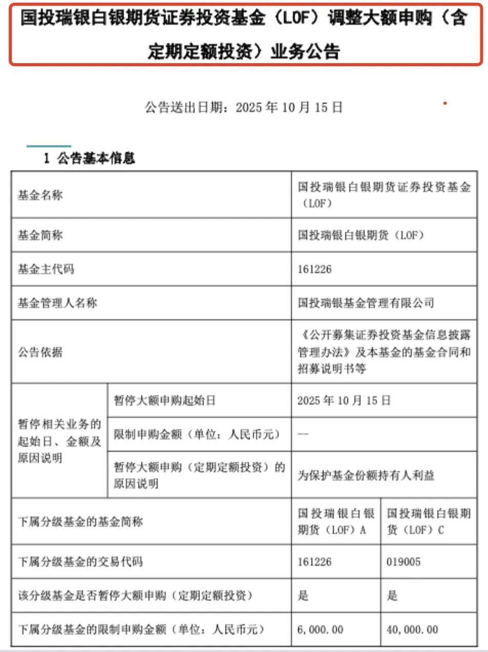 同日,国投瑞银基金也发布公告称,为保护基金份额持有人利益,自 2025 年 10 月 15 日起,限制国投白银 A 类、C 类基金份额的定期定额投资金额分别为 6000 元及 40000 元。
