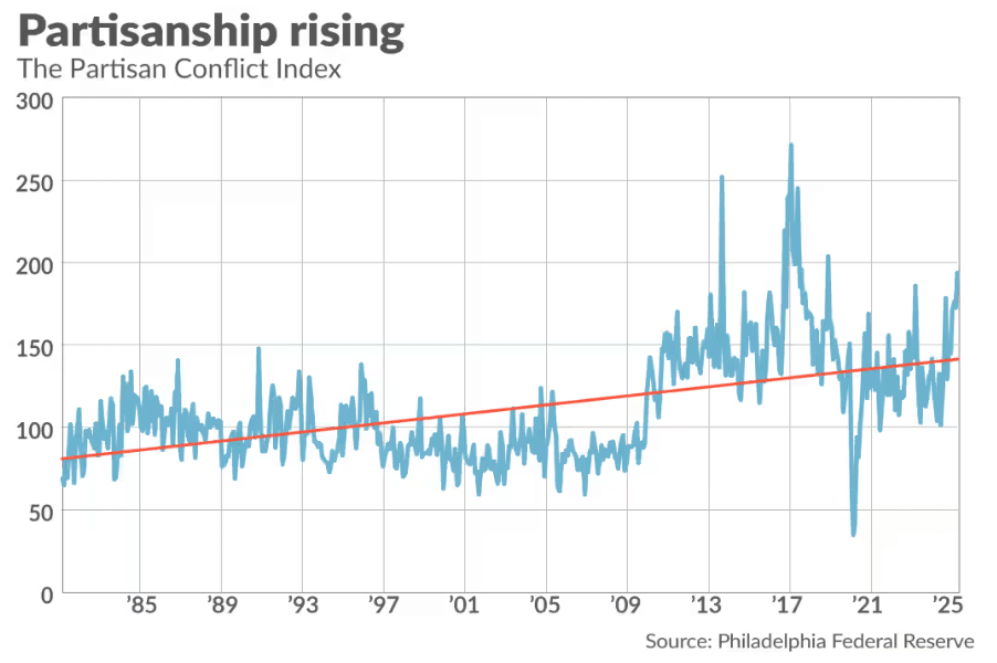 从统计数据来看,这一点非常重要。仅举一个例子,阿齐蒙蒂发现,「2007-2009 年间美国企业投资的下降,有 27% 可归因于党派冲突的加剧」。
