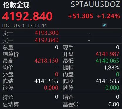 10 月 15 日,国际金价稳步上涨,盘中站上 4200 美元/盎司大关。截至记者发稿,伦敦金现报 4192.84 美元/盎司,日内涨 1.24%,盘中最高触及 4218.13 美元/盎司,再创历史新高。