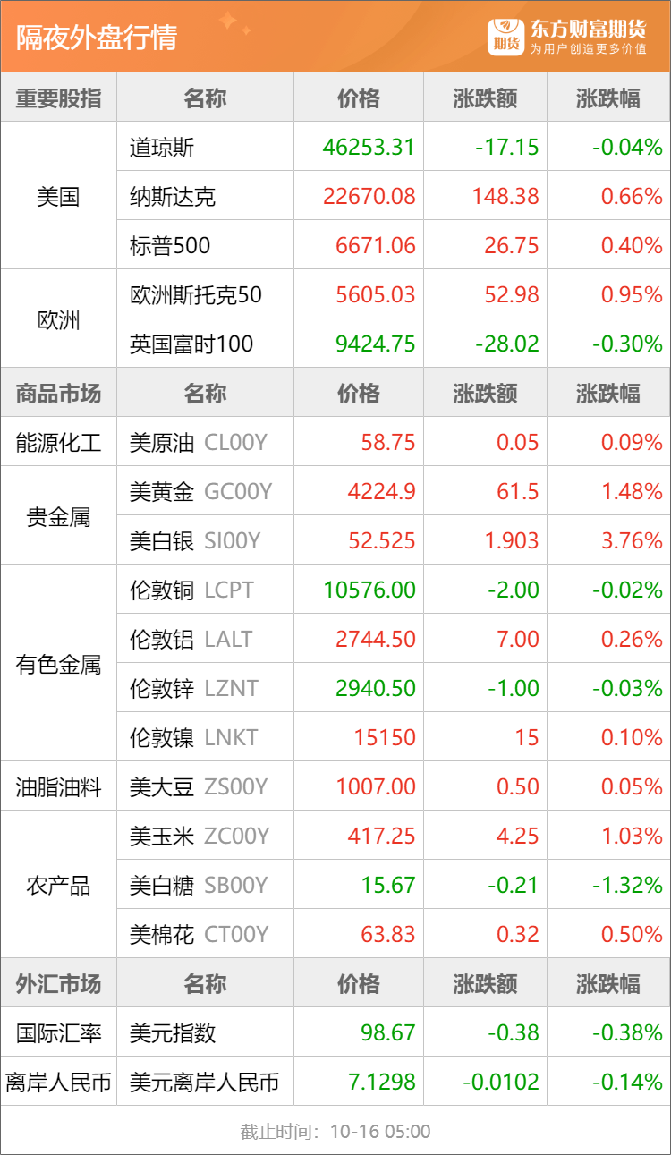 钢材:截止 10 月 15 日当周,据找钢网数据显示,全国重点钢材品种产量、库存如下:全国建材数据产量 460.20 万吨,较上周增加 5.34 万吨;厂库 501.38 万吨,较上周增加 13.22 万吨;社库 568.58 万吨,较上周减少 3.54 万吨;总库存 1069.96 万吨;较上周增加 9.68 万吨;表需 450.52 万吨;较上周增加 76.09 万吨。(找钢网)