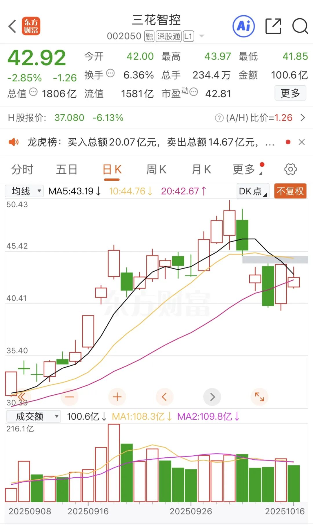 10 月 16 日,三花智控 A 股收跌 2.85%,报 42.92 元/股;港股收跌 6.13%,报 37.08 港元/股。