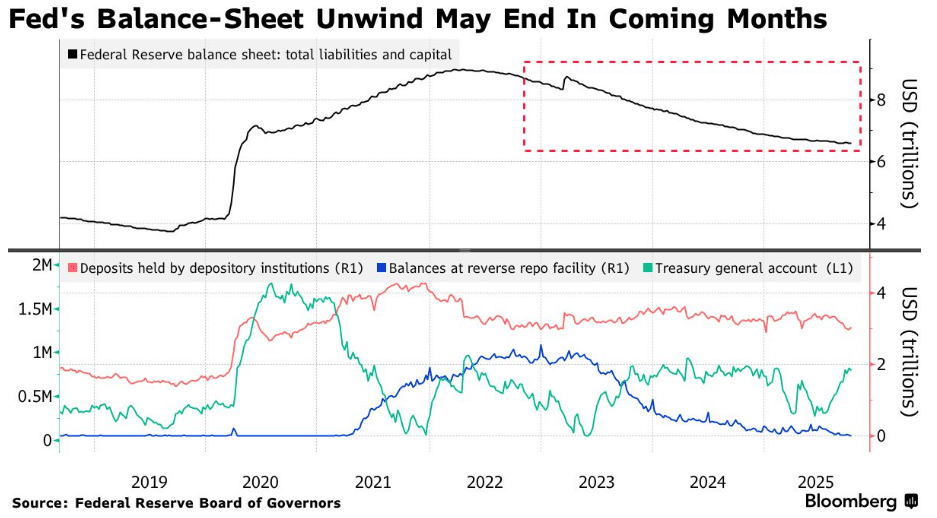 预期转变源于鲍威尔周二的表态:当银行准备金规模略高于决策者认定的 「充裕」 水平 (即避免市场紊乱所需的最低标准) 时,缩表进程将终止。他给出 「未来数月」可能抵达该节点的最强信号,表明美联储认为临界点已近在咫尺。