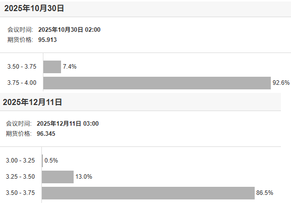 美联储利率观测工具的最新数据显示,美联储 10 月降息 25 个基点的概率达 92.6%,12 月继续降息 25 个基点的概率达 86.5%。目前美联储的目标利率区间为 4%~4.25%。