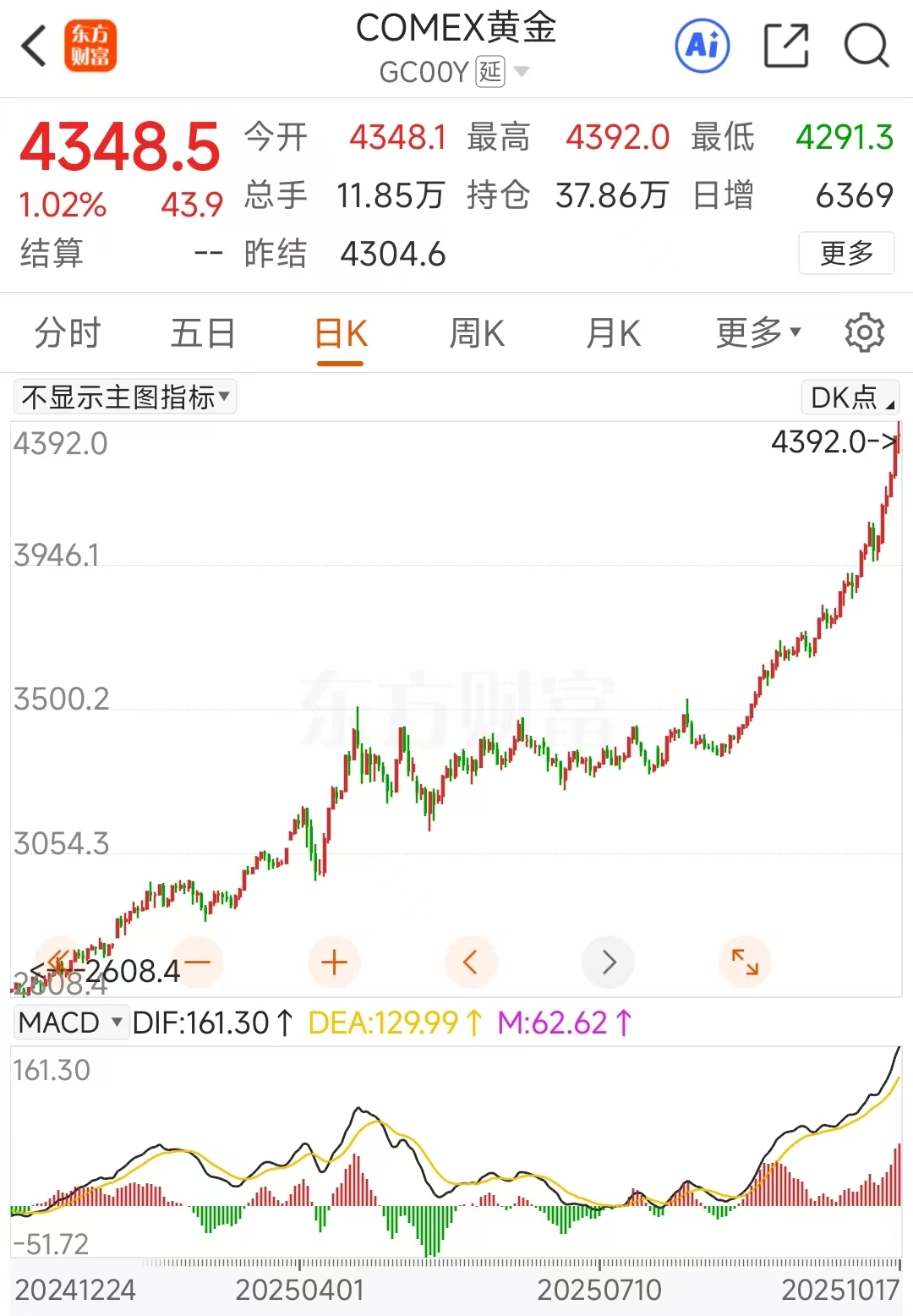 贵金属、珠宝首饰板块的强势,很大程度上受国际金价持续狂飙的带动。COMEX 黄金在 10 月 16 日大涨 3.4% 并突破 4300 美元,10 月 17 日早盘继续拉升并一度逼近 4400 美元,最高触及 4392 美元/盎司。今年以来,COMEX 黄金已累计涨超 60%。