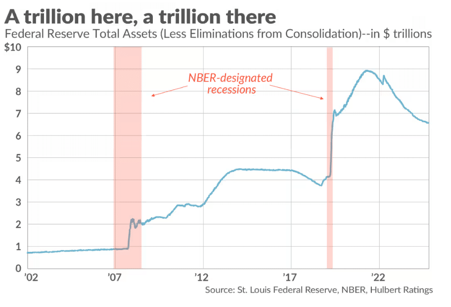 当然,美联储的决定意义重大,该央行一直在从金融体系中抽走大量流动性。由于部分流动性原本可能会流入股市,因此量化紧缩想必一直是股市的重大阻力:自 2022 年 6 月以来,美联储已将其资产负债表缩减了 2.2 万亿美元。从表面上看,结束量化紧缩应该会给股市带来大幅提振。