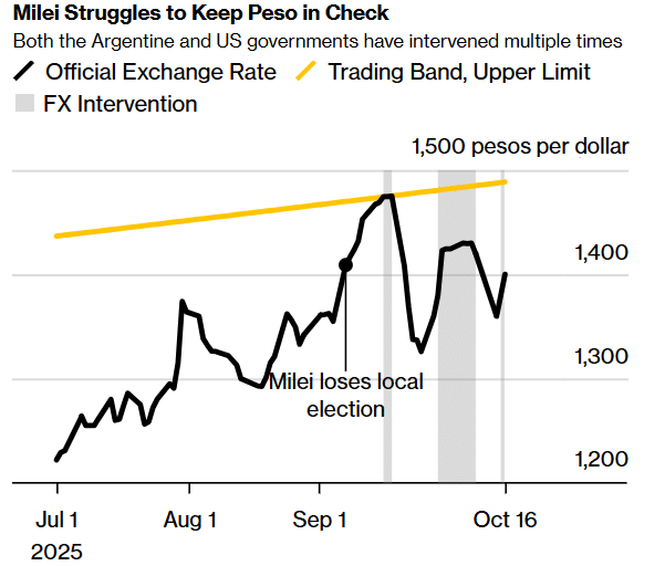 在 9 月 22 日当周贝森特首次承诺援助米莱后出现短暂飙升后,比索重启跌势,自 9 月 29 日以来几乎每个交易日均兑美元走低。周四随着短期利率从高点回落,比索连续第二个交易日走弱。