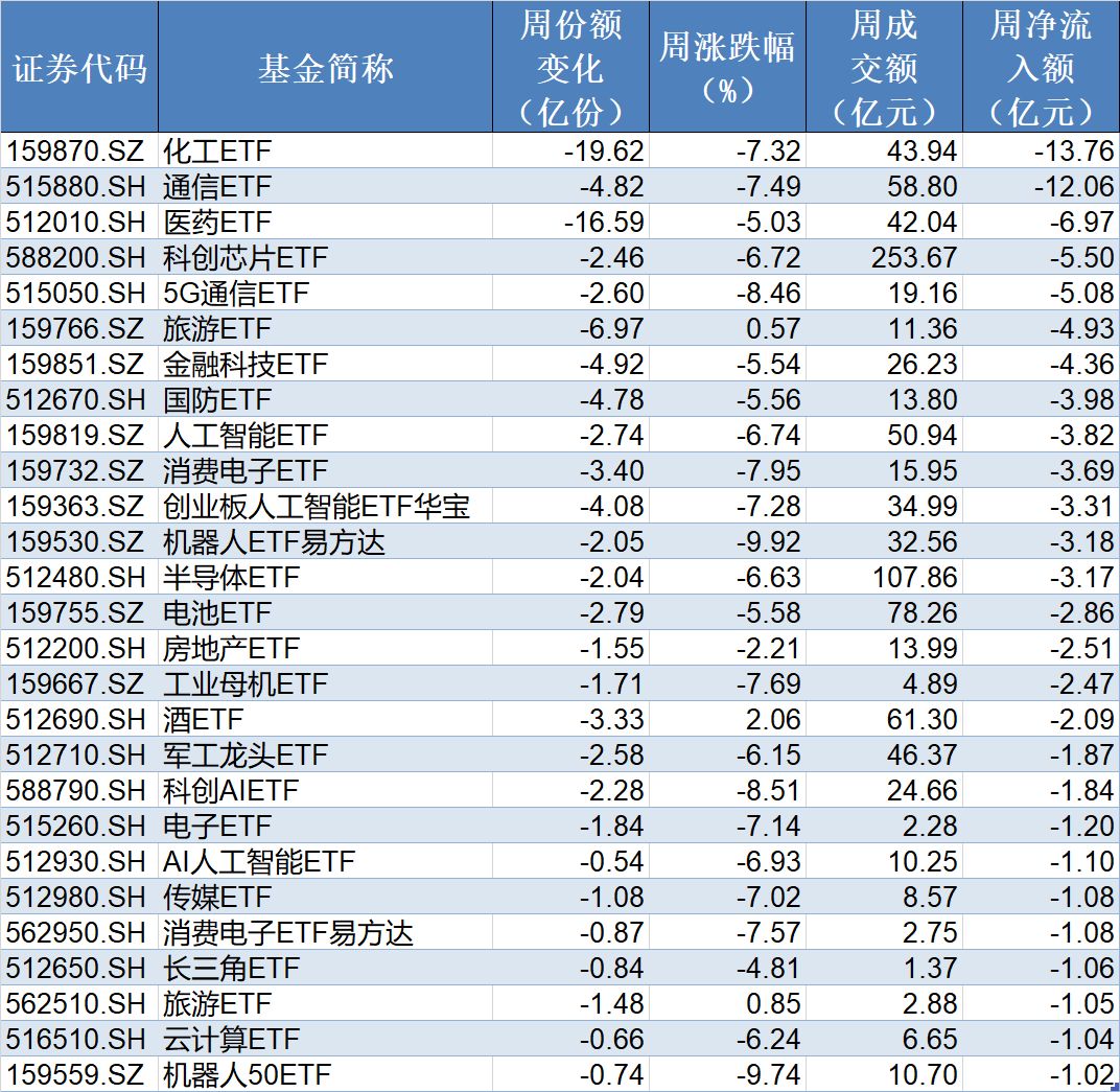 在资金流出方面,本周有 27 只行业主题 ETF 净流出逾 1 亿元,其中化工 ETF、通信 ETF 和医药 ETF 份额分别减少 19.62 亿份、4.82 亿份和 16.59 亿份,分别净流出资金 13.76 亿元、12.06 亿元和 6.97 亿元。