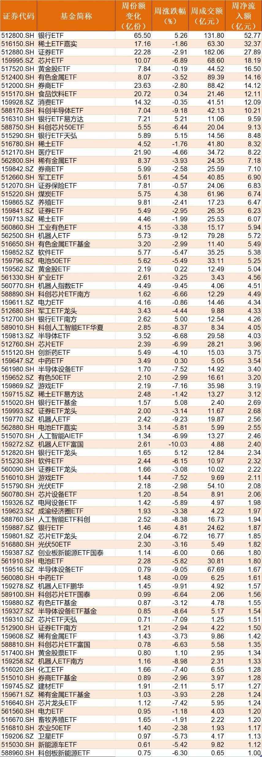 值得注意的是,本周银行板块再度获得资金关注,银行 ETF(512800) 份额增加了 65.5 亿份,升至 253.29 亿份,创上市新高。