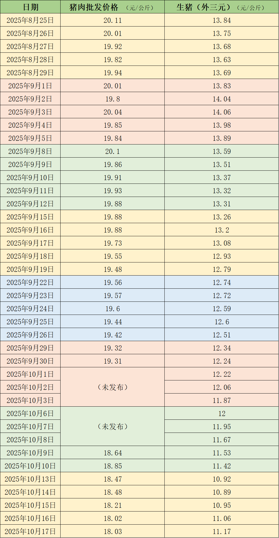 据农业农村部监测,10 月 17 日,全国农产品批发市场猪肉平均价格为 18.03 元/公斤,与上周五 (10 月 10 日) 的 18.85 元/公斤相比,下降 4.4%。本周的平均价格为 18.24 元/公斤,与上周 18.75 元/公斤的均价相比,下降 2.7%;与节前一周 (9 月 22 日-9 月 26 日)19.52 元/公斤的均价相比,下降 6.6%。
